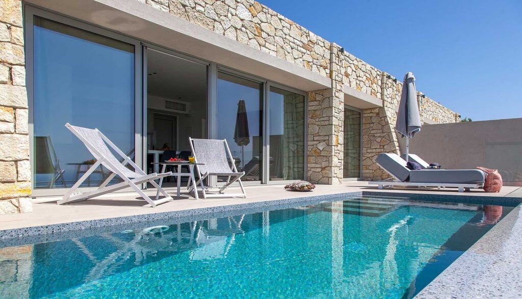 In one of the most beautiful areas of Sivota, on a green hill, just a few minutes from the sea, are the magnificent Sivota Sunset Villas. With a breathtaking view over the Ionian Sea, these brand-new cave style villas will be the idyllic destination for your dreamy holidays. They are located just five minutes from the famous beach Mikri Ammos and ten minutes from the village of Sivota. The modern two-bedroom villa is ideal for up to 4 guests. As you enter the villa, you will find a fully equipped kitchen with a spacious living room. On the right and left you will find two bedrooms with a double bed, each one with its own family ensuite bathroom. From every corner of the villa, you have endless, magical sea views and a magnificent sunset that will refill your soul and body. The outdoor area will amaze you too. You will fall in love with the private infinity pool and all the outdoor area of luxury that offers you every opportunity to sit back and relax. If you want to spend unforgettable moments in Sivota with endless sunsets every evening, then you have found the perfect choice for you.