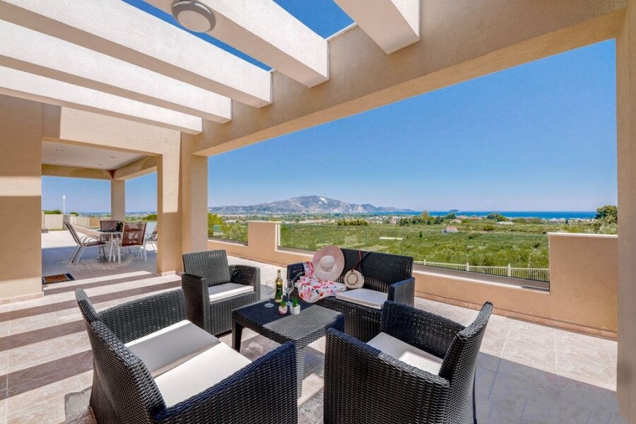 Tucked away on a verdant hillside at Sarakina, among Pantokratora village and the famous resort of Laganas, Villa Hill is waiting to host your next peaceful getaway. Only a 5-minute drive from the villa, the beach of Agios Sostis is practically on your doorstep. Surrounded by olive groves and opening to a view of the tree-covered hillside, the valley below, the bright turquoise sea and Marathonisi island in the distance, villa Hill is a true luxury oasis.